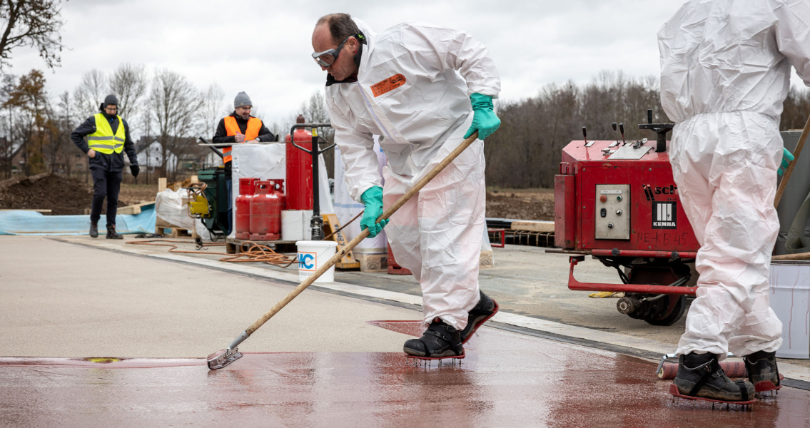 Echterhoff beauftragte die Firma KEMNA BAU Andreae GmbH & Co. KG – ZN Sonderbau West mit den Abdichtungs- und Gussasphaltarbeiten, die die Ausführung dieser Arbeiten im Dezember 2021 unter zumeist widrigen Witterungsverhältnissen wie Temperaturen unter 8 °C sowie hoher Luft- und Bauteilfeuchtigkeit umsetzen mussten. Gemäß den Vorgaben der Bundesanstalt für Straßenwesen, die für derartige Arbeiten eine Abdichtung mit Epoxidharzen oder PMMA-Abdichtungssystemen vorschreibt, hätte eine Ausführung nicht umgesetzt werden können, da sowohl Epoxidharze als auch PMMA bei derartigen Witterungsbedingungen nicht verarbeitet werden können bzw. unerwünschte Nebenreaktionen zeigen. Um die gewünschten Fertigstellungstermine dennoch halten zu können, wurde in Abstimmung mit dem Auftraggeber, der Bundesanstalt für Straßenwesen und der MC-Bauchemie das Spezialharz MC-DUR LF 680 ausgewählt. MC-DUR LF 680 kann bei bis zu 2 °C und vor allem auch bei hoher Luftfeuchte sowie Bauteilfeuchte als Grundierung, Kratzspachtelung und Versiegelung verwendet werden. Das rot-transparente Spezialharz ist zudem hochtemperaturbeständig und härtet sehr schnell aus, sodass Brücken sicher und schnell komplett an einem Tag abgedichtet werden können. MC-DUR LF 680 weist bei 20 °C und einer relativen Luftfeuchtigkeit von 50 Prozent eine Überarbeitungszeit von einer Stunde auf, bei 2 °C beträgt letztere circa zweieinhalb Stunden. Dies ermöglicht auch in den Herbst- und Wintermonaten eine sehr schnelle Applikation der Abdichtungsbahnen, die einmalig in diesem Segment ist; und das ohne eine minderfeste und haftungsstörende Carbamatschicht zu bilden, wie sie zum Beispiel bei Epoxidharzen auftreten kann.