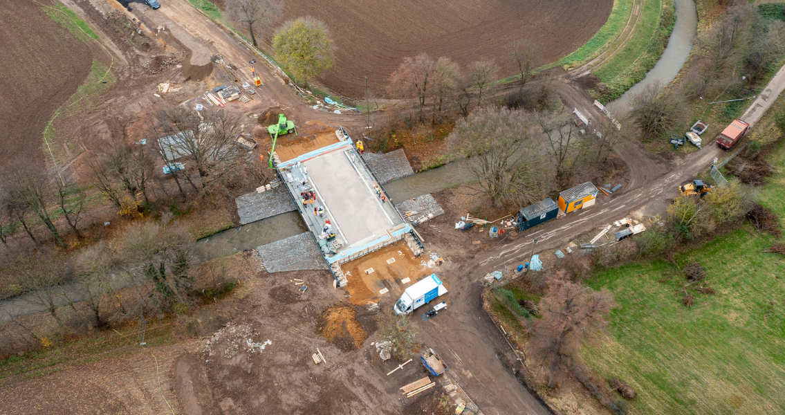 Die Planungs- und Genehmigungsarbeiten für beide Brückenneubauwerke begannen Mitte August 2021. Die neuen Brücken konnten in Rekordzeit bereits im Dezember 2021 fertiggestellt und zur Nutzung freigegeben werden. Möglich gemacht hat diese extrem kurze Planungs- und Ausführungszeit das Echterhoff Expressbrücken-System, bei dem vollvorgespannte Betonfertigteile im Fertigteilwerk vorproduziert und vor Ort wie Bausteine zusammengesetzt werden. Die Vorfertigung der Expressbrücke dauerte rund acht Wochen und der Rückbau der alten Brücken sowie die Errichtung der neuen Brücken ebenfalls rund acht Wochen. So betrug die reine Bauzeit für die Brücken etwa zwei Monate statt der sonst für Baustellen dieser Art üblichen sieben bis acht Monate.