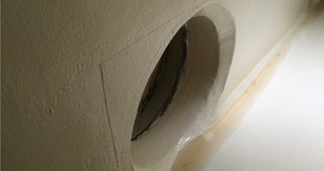 Die Instandsetzungsarbeiten begannen schließlich im Sommer 2015 mit einer umfangreichen Untergrundvorbereitung. Ziel war es zunächst, den geschädigten und nicht tragfähigen Beton abzutragen. Die dabei planmäßig entstandene Querschnittsverringerung wurde durch den Einsatz des Reprofilierungsmörtels und Betonersatzes Nafufill KM 250 HS in Schichtdicken bis 50 mm vollflächig ausgeglichen. Auf die so vorbereiteten Flächen wurde das mineralische Spezialoberflächenschutzsystem MC-RIM PROTECT als kapillarbrechende Schicht gegen möglichen rückwärtigen Feuchteeinfluss aufgetragen. Für die horizontalen Flächen kam MC-RIM PROTECT-H in Schichtdicken von 20 mm zum Einsatz. Auf die vertikalen Flächen und Überkopfbereiche wurde MC-RIM PROTECT im Nassspritzverfahren in 15 mm Schichtdicke eingebaut. Ohne die BSK-Belastung wäre das Bauwerk durch die Beschichtung mit dem MC-RIM PROTECT-System nachweislich bereits dauerhaft gegen aggressive Abwässer bis zu einem pH-Wert von 3,35 geschützt gewesen. Im vorliegenden Fall erfolgte der eigentliche Schutz vor biogener Schwefelsäurekorrosion aber mit MC-PowerPro HCR, das vollflächig unter Einbeziehung der ebenfalls BSK-gefährdeten Rohreinbindungen aufgetragen wurde. Die Applikation erfolgte bei diesem Projekt händisch im Spachtel- und Rollverfahren in mehreren aufeinander abgestimmten Arbeitsgängen. Soweit es die baulichen Randbedingungen zulassen, ist grundsätzlich auch eine Applikation im Airless-Spritzverfahren möglich.